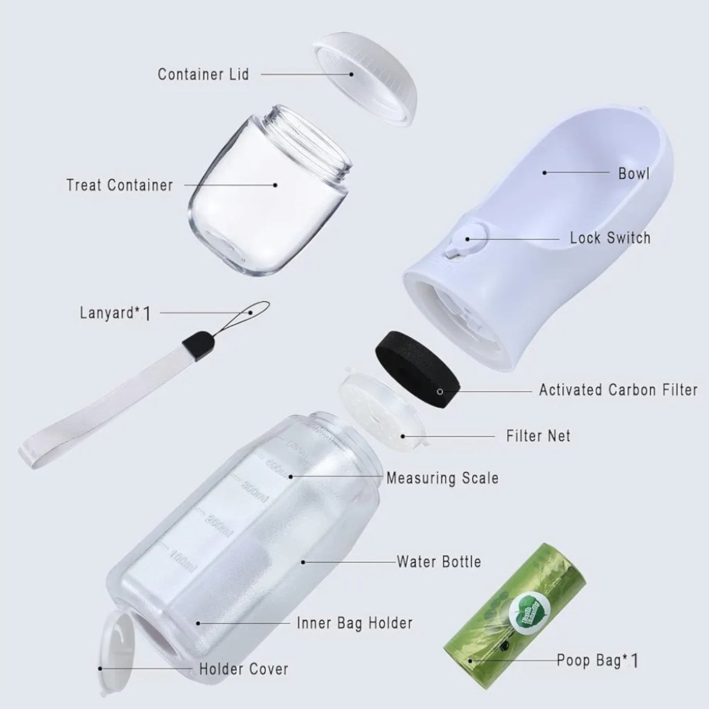 - _Perfect Dog Water Bottle Combo_ Step up your pet’s adventure game with our 20oz portable dog water bottle & treat container combo! Unlike ordinary bottles, ours boasts a clever 100g snack compartment seamlessly integrated with the trough. Detachable via a chic lanyard, a must-have pet accessory that ensures your dog stays hydrated and fueled on-the-go.