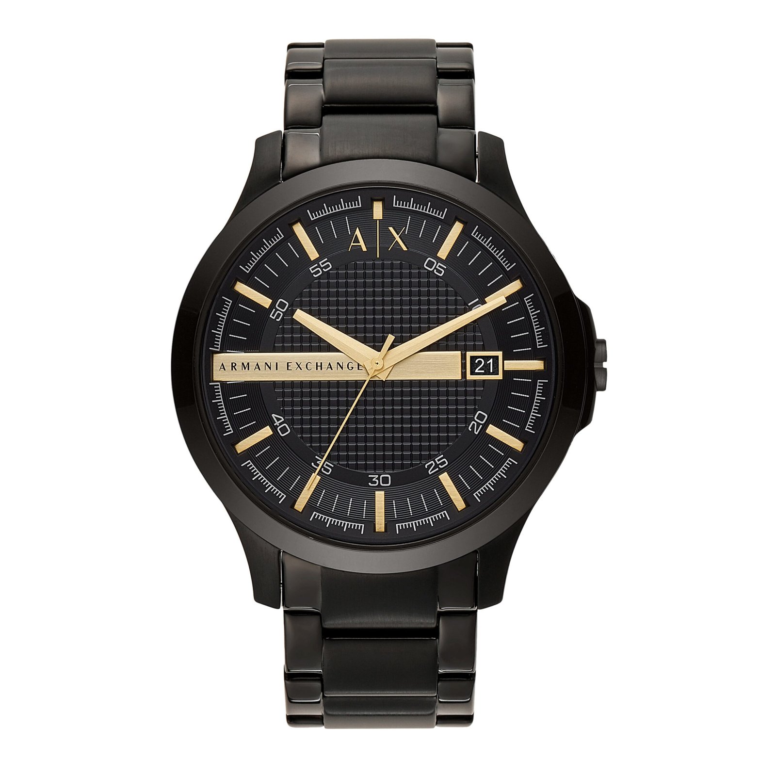 Armani Hampton AX2413 blends bold design with refined craftsmanship in a black stainless steel finish. The 46 mm case (4.6 cm) frames a black sunray dial with gold-tone accents and a textured grid pattern, creating a modern yet timeless aesthetic. A robust stainless steel bracelet provides lasting comfort and durability, while the quartz movement delivers precise timekeeping. With a discreet date display, 50 metres water resistance, and a mineral glass face with a unidirectional bezel, this men’s watch pairs formal polish with everyday practicality. Ideal for wrist style that transitions from boardroom to sunset, it exudes quiet confidence on any occasion.