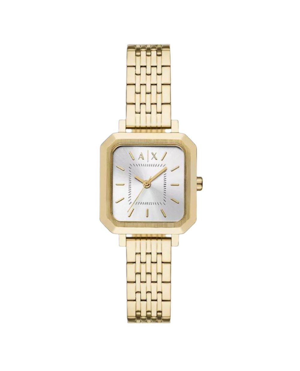 Armani refines the women’s watch AX5725 with a gold-tone stainless steel square case and linked bracelet, pairing contemporary geometry with timeless Italian elegance. The 2.7 cm case frames a silver dial, accented by minimalist gold markers and protected by a durable mineral crystal. A slim 1.2 cm strap width and foldover clasp keep the fit clean and secure, while a quartz three-hand movement delivers precise timekeeping. With 50 metres of water resistance and a strap inner circumference of about 17.5 cm (±0.5 cm), this versatile women’s watch transitions from formal events to everyday wear, elevating any ensemble with understated glamour.