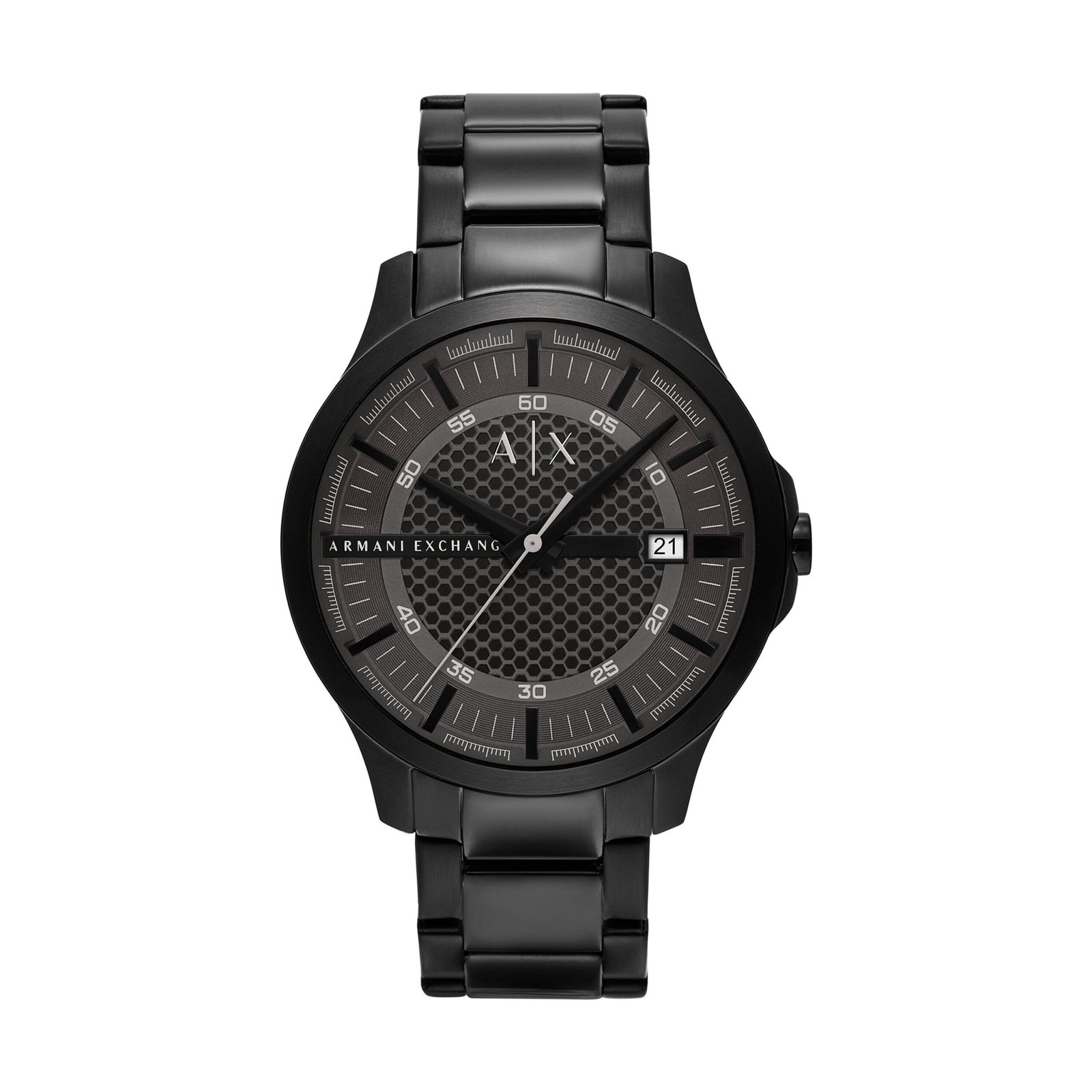Crafted by Armani, the AX2464 men’s watch blends refined minimalism with a bold presence. The 46 mm black stainless steel case frames a textured gray dial for legible timekeeping and quiet sophistication. A quartz three-hand movement with a discreet date window delivers reliable accuracy, while a smooth black stainless steel bracelet and 2-pusher foldover clasp ensure durable, comfortable wear. Mineral crystal protects the dial, and 5 ATM (50 metres) water resistance suits everyday life from rain to hand-washing. Dimensions: case 4.6 cm, strap width 2.2 cm, strap inner circumference about 20.0 cm. This men’s watch elevates modern tailoring with lasting craft.