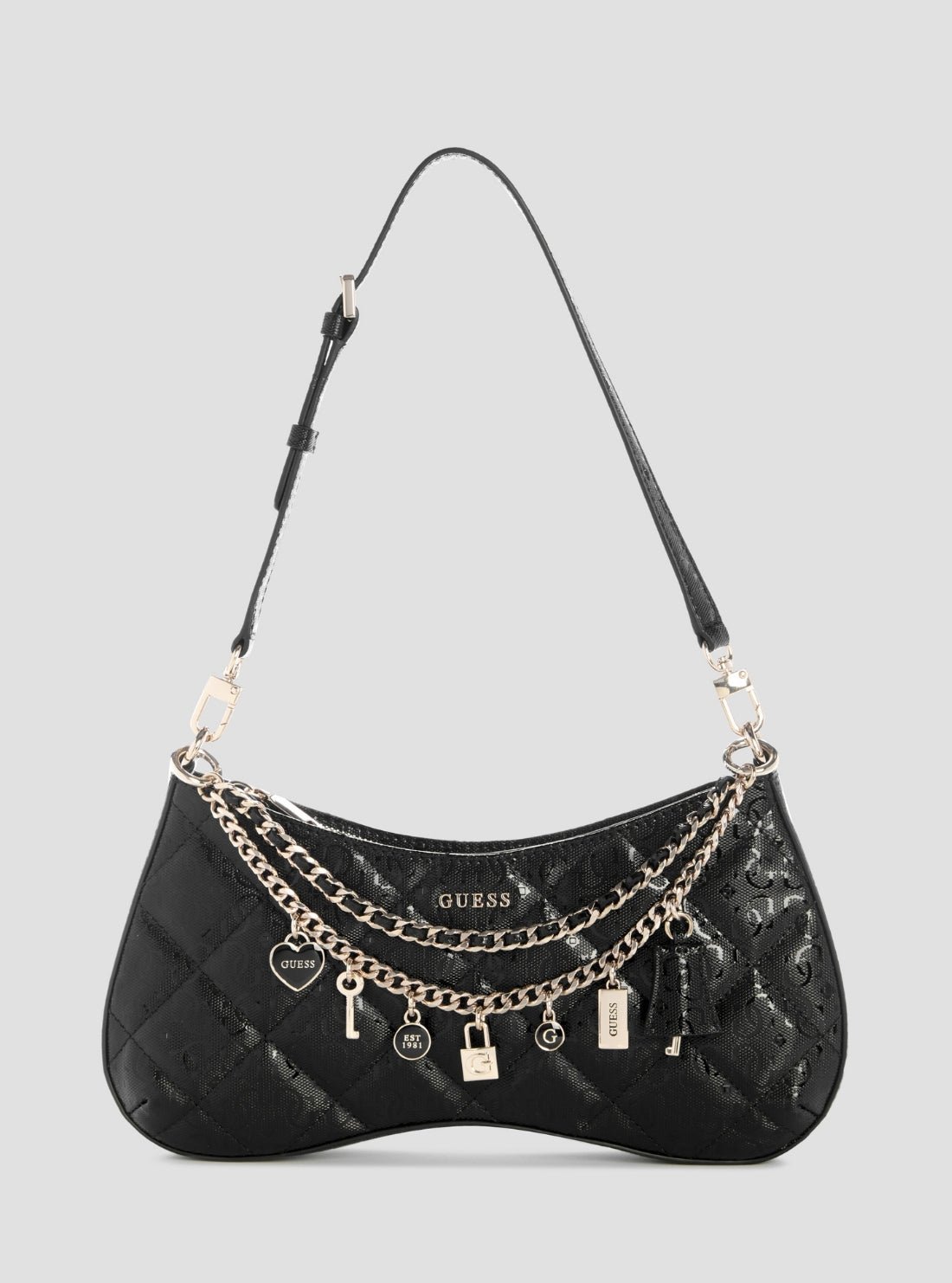 Add a bold statement to your evening and everyday looks with the Black Libby Shoulder Bag. Crafted from glossy eco shine PU, this sleek quilted design is elevated with layered chain detailing and charm accents for a luxe finish. Designed with a slim shoulder silhouette and shiny gold hardware, it delivers standout style with effortless wearability.