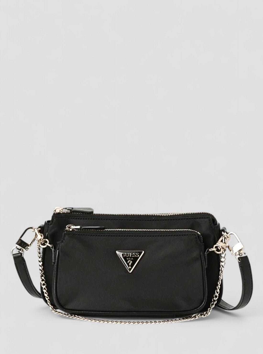 Keep your essentials close with the Black Little Bay Mini Crossbody Bag. Crafted from durable nylon, this compact crossbody features a sleek silhouette accented with the signature GUESS triangle logo plaque. Designed with a zip-top closure, chain and leatherette strap, and gold-tone hardware, it’s the perfect lightweight accessory for effortless everyday wear.