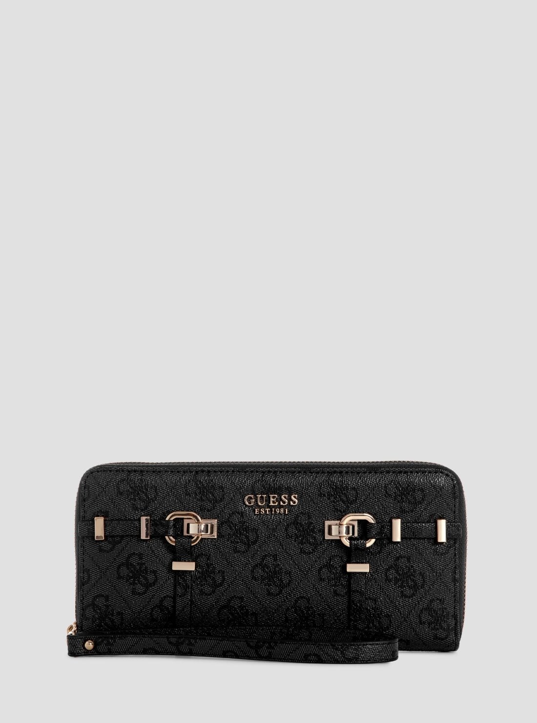Add a sleek, organised finish to your everyday essentials with the Black Logo Leona Large Zip-Around Wallet. Crafted from eco-basique PU with an all-over logo print, this streamlined silhouette features a spacious interior and detachable wrist strap for versatile carrying. Finished with shiny gold hardware, it’s designed to keep your cards and cash secure in refined style.