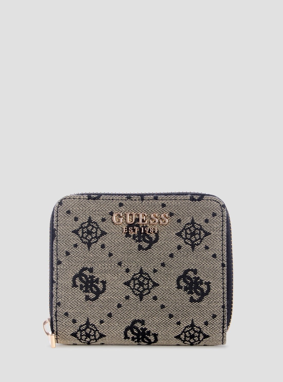 Keep your essentials organised in timeless style with the Black Logo Melinda Small Zip Around Wallet. Designed in 4G Peony Jacquard with smooth PU trim, it features card slots, a coin pocket, and a secure zip closure. Compact and elegant, it’s perfect for slipping into your favourite GUESS handbag.
