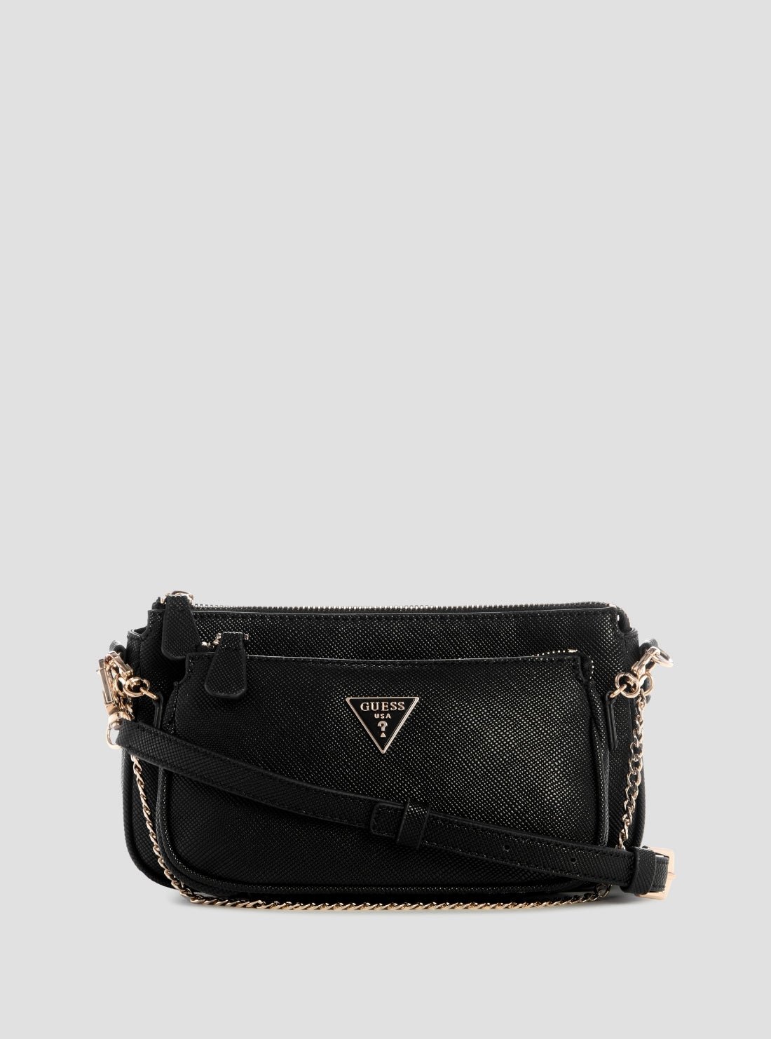 Stay effortlessly organised with the Black Logo Noelle II Double Pouch Crossbody Bag. Styled in a classic sleek black colourway, this compact crossbody is perfect for everyday use. It features two zip-top compartments to keep your essentials secure and separate, and is finished with gold-tone hardware and the iconic GUESS triangle logo plaque. A detachable strap with chain detailing adds a chic edge to this versatile accessory.