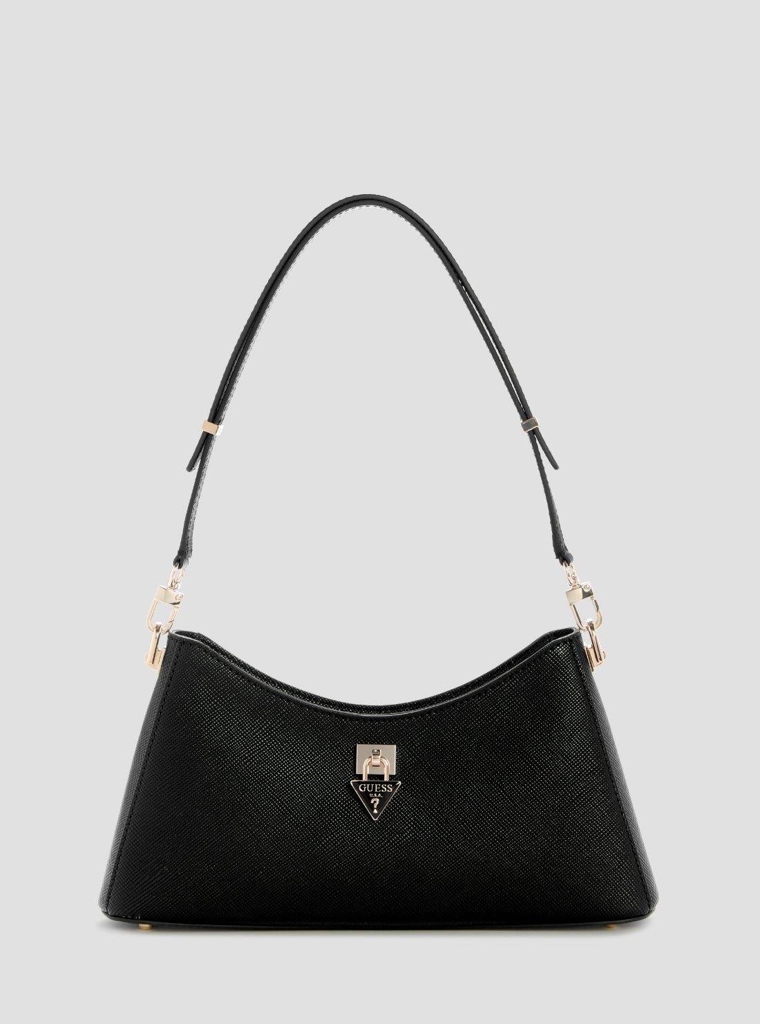 Add a timeless finishing touch to your everyday looks with the Black Patsie Shoulder Bag. Crafted from structured eco saffiano PU, this sleek shoulder silhouette features a clean profile accented with a refined metal logo detail. Finished with shiny gold hardware, it’s a versatile essential designed for polished day-to-night styling.