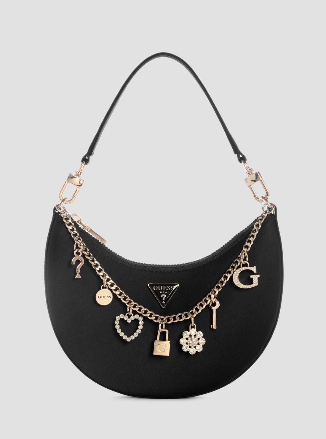 Elevate your everyday look with timeless sophistication using the Black Tasmin Mini Shoulder Bag. Crafted from satin, this chic mini shoulder bag features a sleek curved silhouette adorned with decorative charm detailing and a delicate chain accent, finished with shiny gold hardware for an elegant touch. Lightweight and compact, it’s the perfect statement accessory for evening looks or elevated day styling.