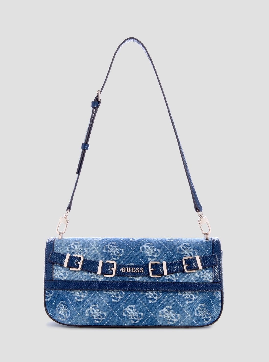Add a modern denim touch to your everyday rotation with the Blue Logo Dovie Flap Shoulder Bag. Crafted from signature 4G denim jacquard, this structured silhouette features a sleek flap front accented with buckle detailing for a polished finish. Designed to sit comfortably on the shoulder, it blends casual texture with refined GUESS styling.