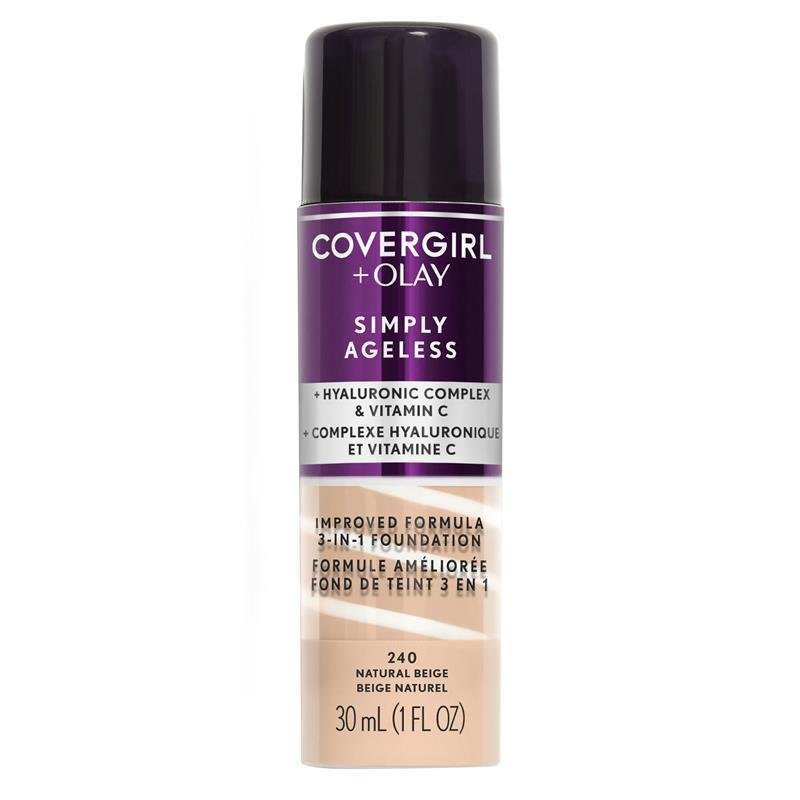 Give your skin that youthful glow with Covergirl & Olay Simply Ageless 3-in-1 Liquid Foundation. This anti-aging foundation plumps up skin to instantly reduce the appearance of wrinkles for a younger-looking complexion. Skin tone looks more even and other imperfections are blurred, while hyaluronic complex and vitamin C deliver firming hydration to keep your skin looking healthy and radiant. Pro-tip: Use with Covergirl Simply Ageless Anti-Aging Foundation Primer for maximum results. COVERGIRL, a cosmetics category leader, celebrates authenticity, diversity and self-expression through makeup. Born in 1961, COVERGIRL offers accessible, affordable, and inclusive makeup for everyone. Through the years, COVERGIRL has partnered with a number of inspirational, barrier-breaking, and diverse women as the faces of the brand. In 2018, COVERGIRL became the largest makeup brand to be Leaping Bunny Certified by Cruelty-Free International, which means all of our products are certified cruelty free, no matter where we are sold.