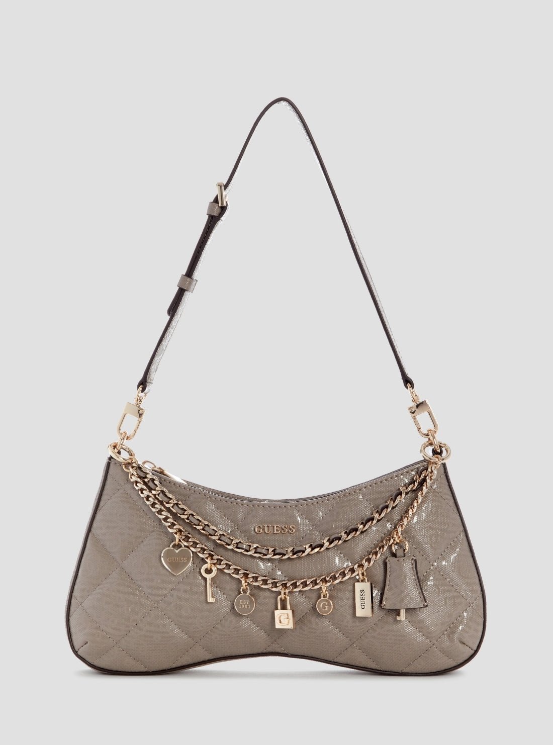 Add a bold statement to your evening and everyday looks with the Dark Taupe Libby Shoulder Bag. Crafted from glossy eco shine PU, this sleek quilted design is elevated with layered chain detailing and charm accents for a luxe finish. Designed with a slim shoulder silhouette and shiny gold hardware, it delivers standout style with effortless wearability.