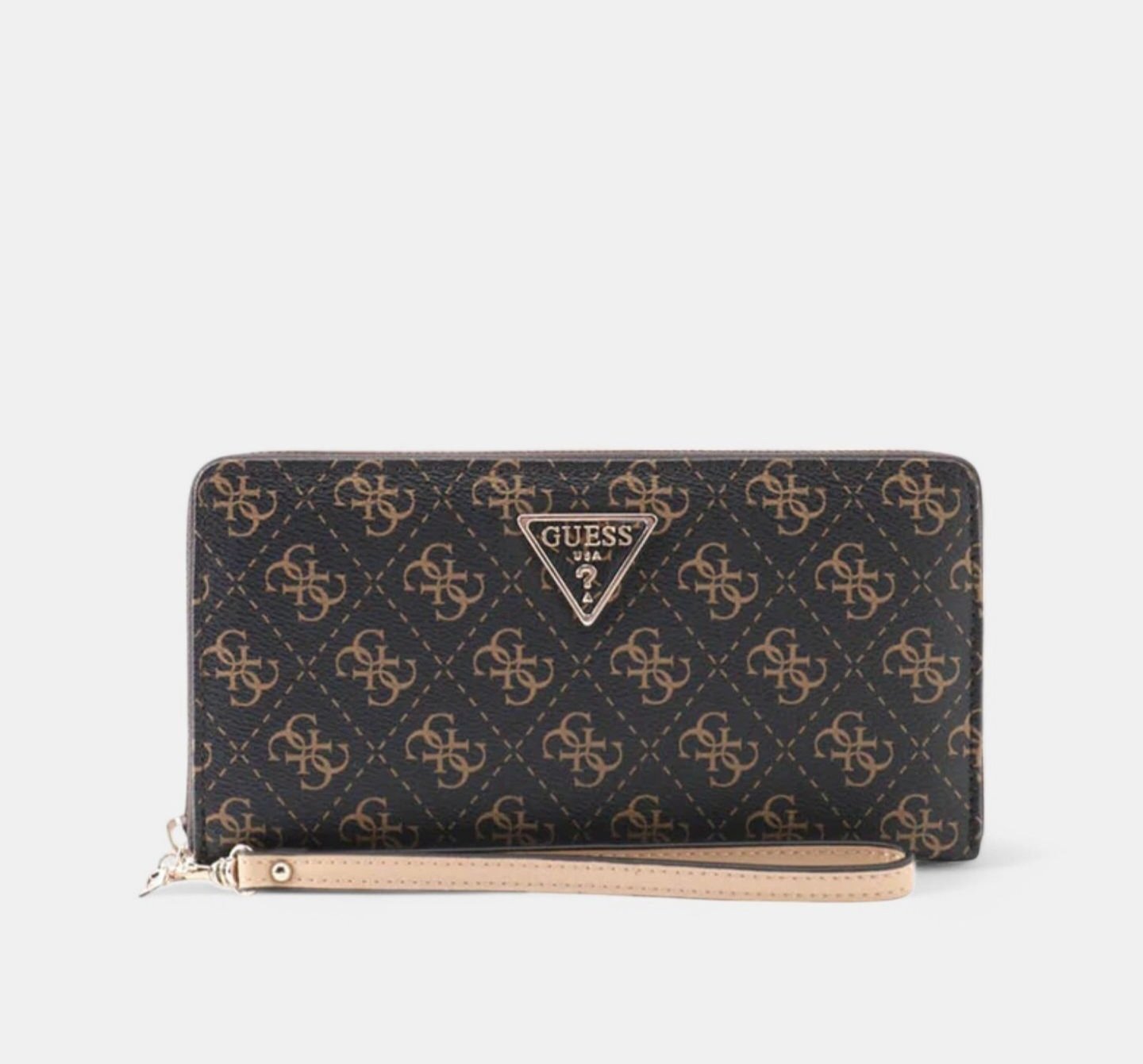 Stay stylish and organized with the Noelle SLG Cheque Organiser by GUESS. Designed in a classic brown logo print, this wallet offers ample storage with a zip-around closure for security. Featuring an exterior zip pocket, four interior slip pockets, a zip pocket, 14 card slots, and two ID windows, it provides effortless organization. The detachable wristlet adds convenience, while shiny gold hardware enhances its elegant appeal.