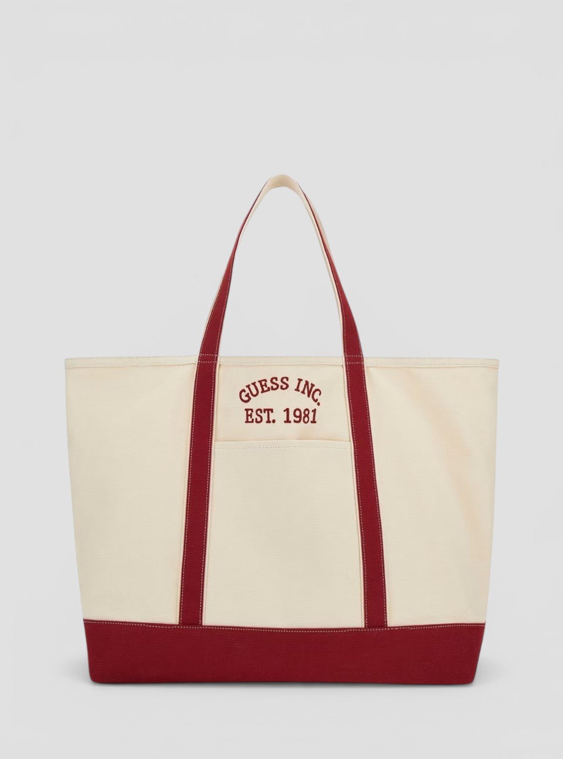 Carry it all in effortless style with the Natural Red Summerline Extra Large Tote Bag. Crafted from durable cotton canvas with a bold two-tone design, this oversized silhouette is perfect for travel, beach days, or everyday errands. Finished with an embroidered collegiate-inspired logo and practical exterior pockets, it blends function with casual, laid-back appeal.