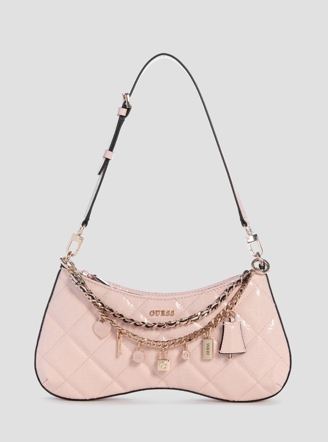 Add a bold statement to your evening and everyday looks with the Pink Libby Shoulder Bag. Crafted from glossy eco shine PU, this sleek quilted design is elevated with layered chain detailing and charm accents for a luxe finish. Designed with a slim shoulder silhouette and shiny gold hardware, it delivers standout style with effortless wearability.