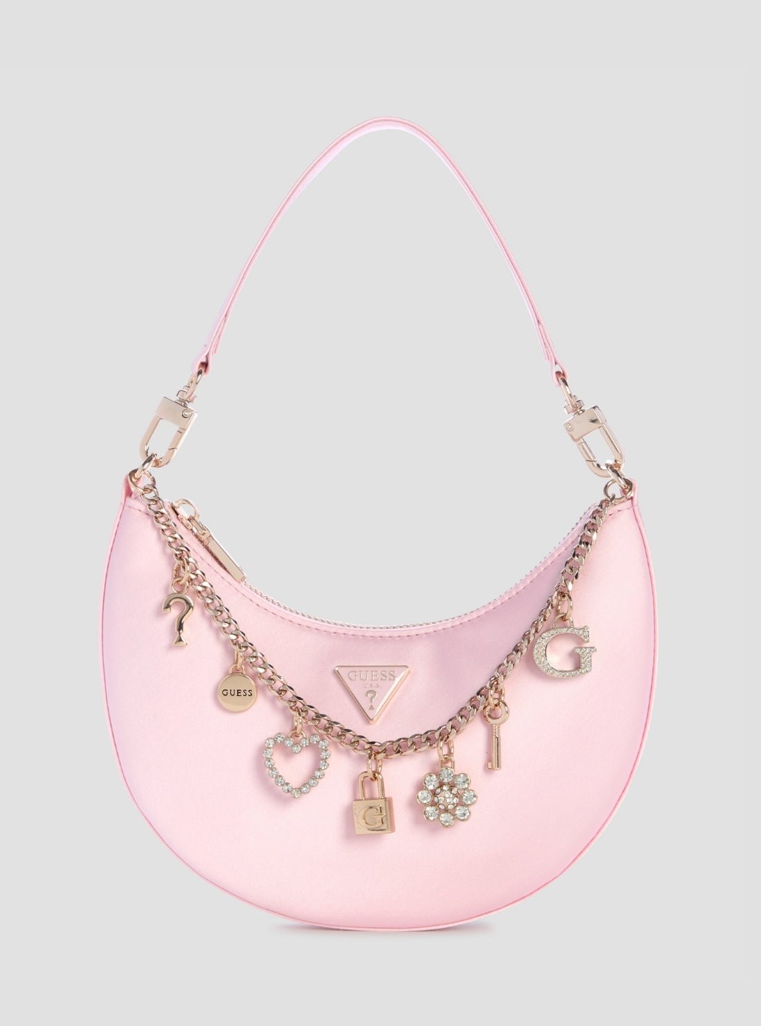 Elevate your everyday look with timeless sophistication using the Pink Tasmin Mini Shoulder Bag. Crafted from satin, this chic mini shoulder bag features a sleek curved silhouette adorned with decorative charm detailing and a delicate chain accent, finished with shiny gold hardware for an elegant touch. Lightweight and compact, it’s the perfect statement accessory for evening looks or elevated day styling.