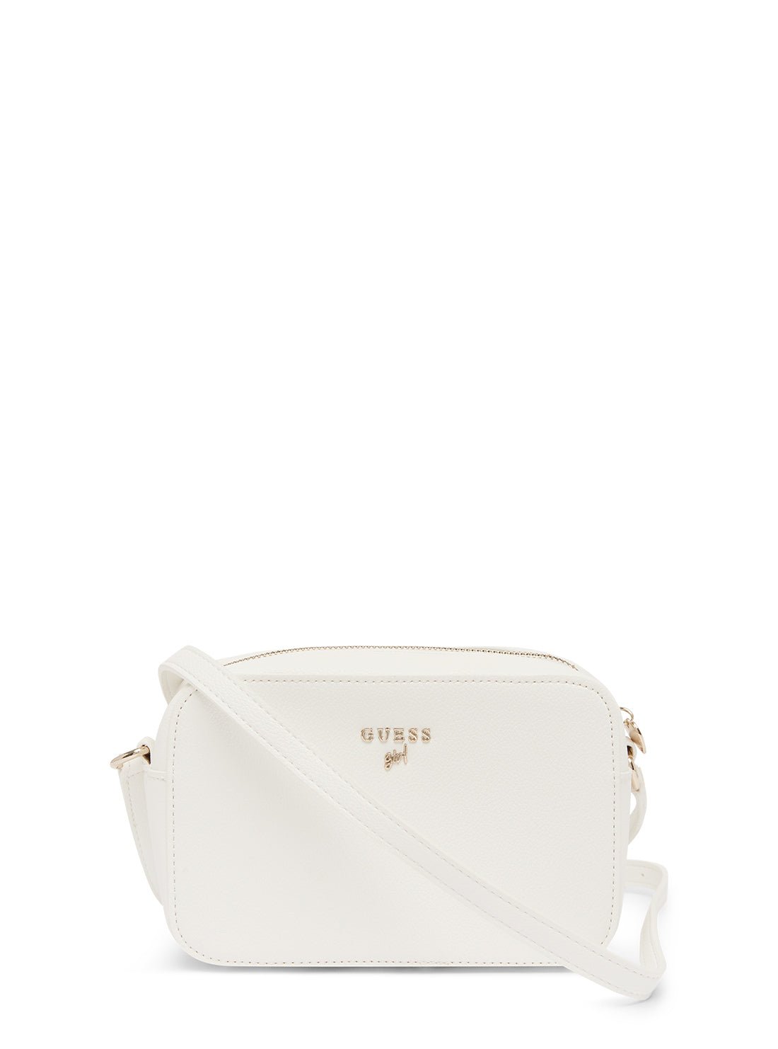 Minimalist yet modern, the Kids Camera Bag in white is a versatile crossbody perfect for everyday style. Crafted from smooth faux leather, this compact design features a bold tonal Guess script on one side and a classic metallic logo on the other. The zip-top closure and long crossbody strap offer functionality with a fashion-forward edge.